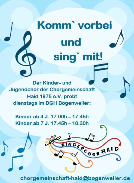 spannendes Kreativprojekt und sucht begeisterte Mitmacher! Von Mai bis November wird das Kindermusical „Franziskus“ einstudiert, das am 21. November 2026 im Dorfgemeinschaftshaus Bogenweiler zur Aufführung kommt. Mitmachen können Kinder ab 4 Jahren, die Freude am Singen haben oder erste Bühnenerfahrungen sammeln möchten. Die Proben finden immer dienstags von 17:00 – 17:45 Uhr für die Kinder bis zur ersten Klasse statt. Die größeren Kinder, ab Klasse 2, proben von 17:45 – 18:30 Uhr. Doch nicht nur Stimmen sind gefragt: Auch für Schauspielrollen sowie die Bühnengestaltung (ab 12 Jahren) werden engagierte Kinder und Jugendliche gesucht. Ausführliche Infos unter dieser Seite: http://www.bogenweiler.de/musical2026.html Downloads: Flyer Aktuelle Probezeiten Bericht veröffentlicht: 2026-04-18 |